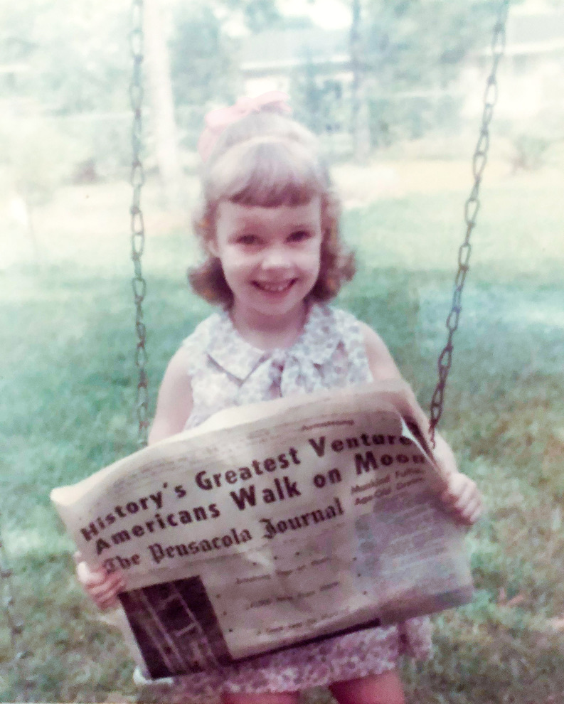 Later, as I played on my swing set, they handed me the newspaper and snapped my photo with the bold headline: “America’s Greatest Venture: Americans Walk on Moon.” I grew up thinking space travel was normal.